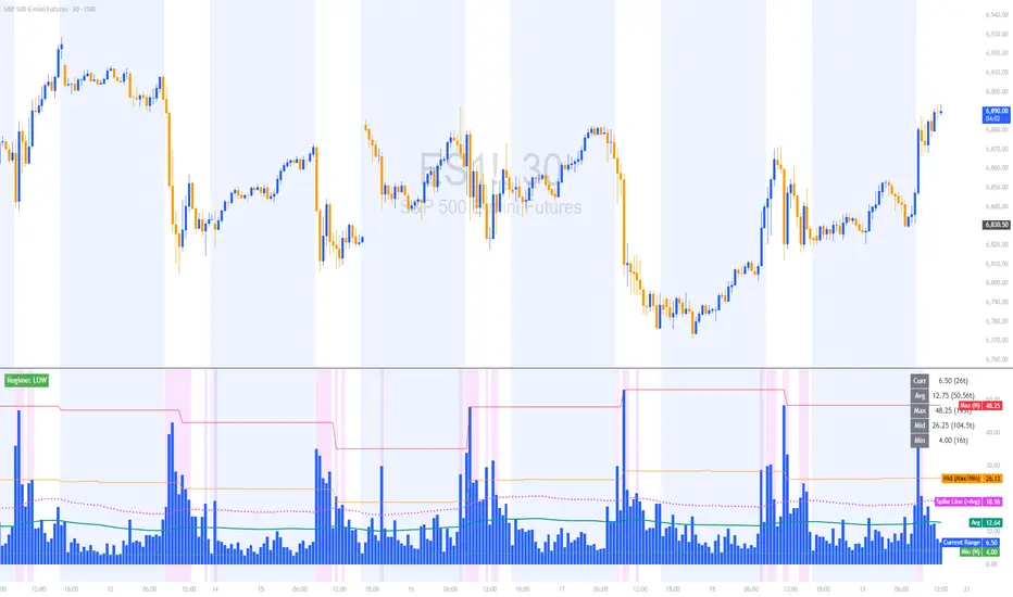 Range Regime (RR) is a volatility/range monitoring indicator designed to help you quickly understand whether the market is *quiet, normal, or expanding* on the current timeframe.