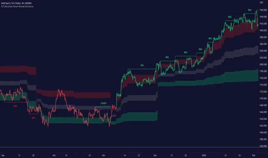 The Donchian Structure Indicator displays CHoCH, SMS, BoS/BMS, as well as premium and discount areas. This indicator plots everything in real-time and allows for easy backtesting on any market and timeframe. A unique candle coloring has been added to make it more engaging and visually appealing when identifying new trading setups and strategies. This candle coloring is "leading," meaning it can signal a structural change before it actually happens, giving traders ample time to plan their next trade accordingly.