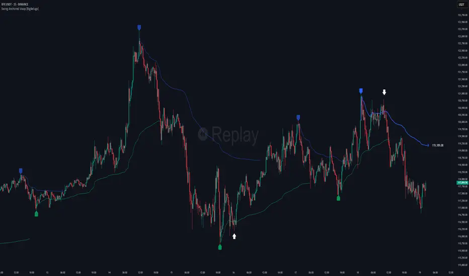 Swing Anchored Vwap [BigBeluga] tracks the market’s directional behavior by anchoring VWAPs (Volume Weighted Average Price) to dynamically detected swing highs and lows. It visually distinguishes the active swing VWAP from historical ones—offering traders a clean view of trend-aligned value zones with clearly marked inflection points.