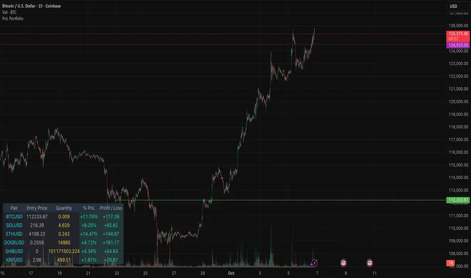 For each asset, simply input the Pair Symbol, Average Entry Price, and Position Quantity. The script securely fetches the current market price and dynamically calculates and displays a customizable table showing:
