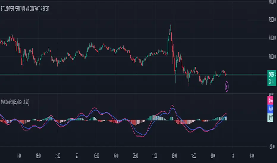 The MACD on RSI indicator combines elements of the Moving Average Convergence Divergence (MACD) and the Relative Strength Index (RSI). It calculates the RSI on a specified source with a customizable length, then applies two exponential moving averages (EMAs) to the RSI values. The difference between these EMAs forms the MACD line, visually representing the momentum of the RSI.