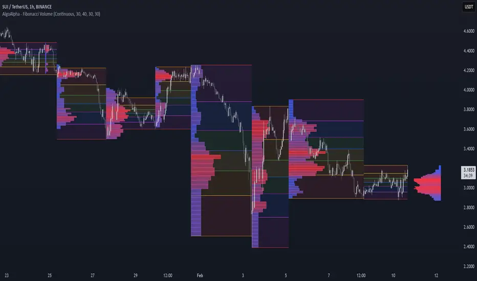 Unlock a deeper understanding of price action with the Fibonacci Volume Profiles indicator by AlgoAlpha! This powerful tool blends Fibonacci retracement levels with customizable volume profiles, helping traders identify high-probability areas of support, resistance, and accumulation. Designed for both continuous dynamic levels and custom time periods, this indicator is a must-have for traders seeking confluence in market structure analysis.
