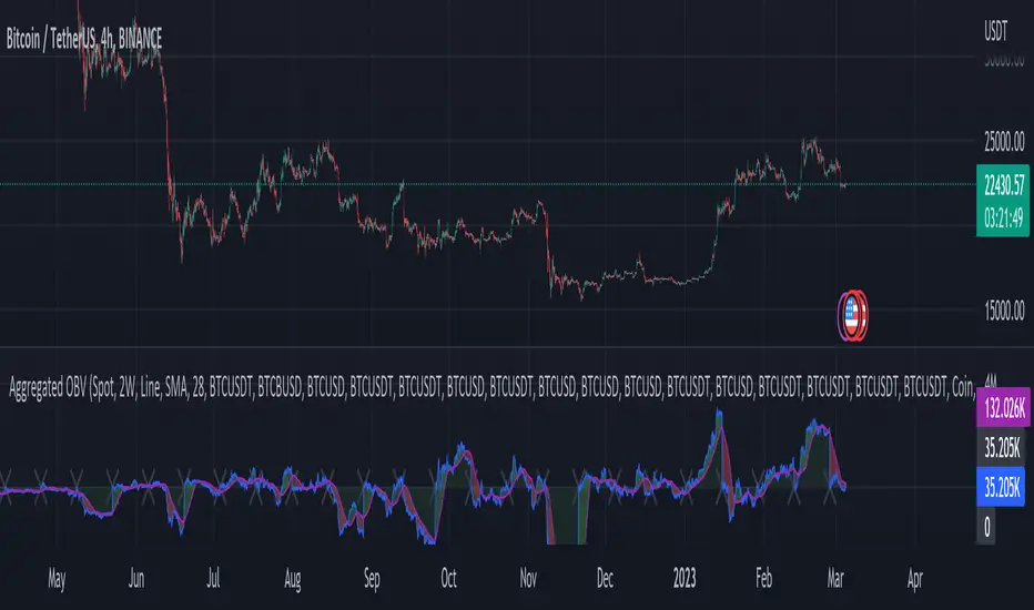 As normal OBV, this indicator can be used to find divergences and to have an idea of volume flow. Using aggregated data makes it more accurate and allows to compare volume flow between different kinds of markets (Spot, Futures, Perpetuals, Futures+Perpetuals and All Volume).