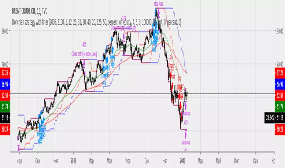 The main idea was borrowed from the book "Way of the Turtle: The Secret Methods that Turned Ordinary People into Legendary". The strategy is based on the donchian channels and is one of the oldest and easiest strategy in the using. Also strategy include risk managment and trends filter which prevent false entries and high drawndowns. The results are based on the period from 2006 to present, but you can also change timeframe and period of backtesting.