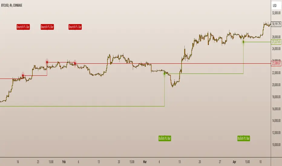 The "P.I.B. System (Pin Bar | Inside Bar)" script is designed to help traders identify potential reversal points in the market by detecting bullish and bearish pin bars and inside bars. A pin bar is a candlestick pattern that indicates a potential reversal, characterized by a small body and a long wick. Inside bars are candlestick patterns where the current bar's high and low are within the previous bar's range, indicating potential consolidation before a breakout.