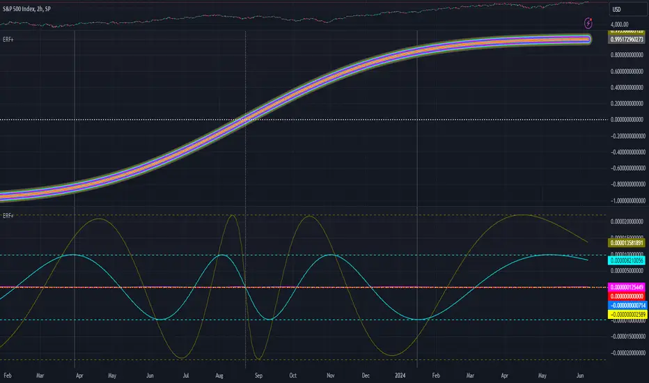 To showcase the characteristics and performance of my ERF/ERFI formulations, I devised a multi-modal script. By using bar_index, I generated a broad sequence of numeric values to input into the first ERF/ERFI parameter. These sequences allow you to inspect the contours of the error function's outputs for both ERF and ERFI. When combined with compute-intensive precision functions (CIPFs), the polynomial function output values can be subtracted from my CIPFs to obtain results of absolute error, displaying the accuracy of the many polynomial estimation functions I tuned in testing for Pine's float environment.