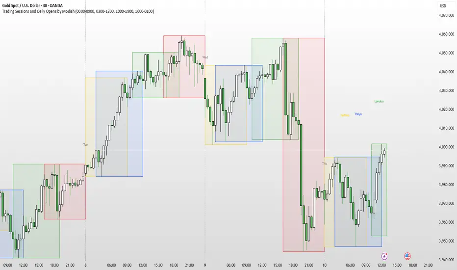 This Pine Script indicator overlays key forex trading sessions (Sydney, Tokyo, London, New York) on your chart using Kenyan time (EAT/UTC+3), with customizable translucent boxes, borders, and labels positioned neatly above each session for clear visualization. It also plots dotted vertical lines at daily opens (Monday-Friday) with abbreviated day labels for quick reference. Toggle sessions on/off, adjust colors, and ensure seamless integration with candlesticks for dynamic, real-time analysis. Ideal for session-based traders seeking precise timing and structure.