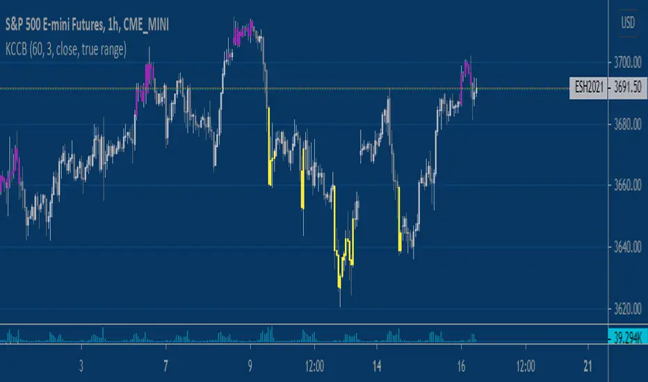Another tweak to a classic built-in script. Simply replacing the Keltner Channels overlay plot with color bars.