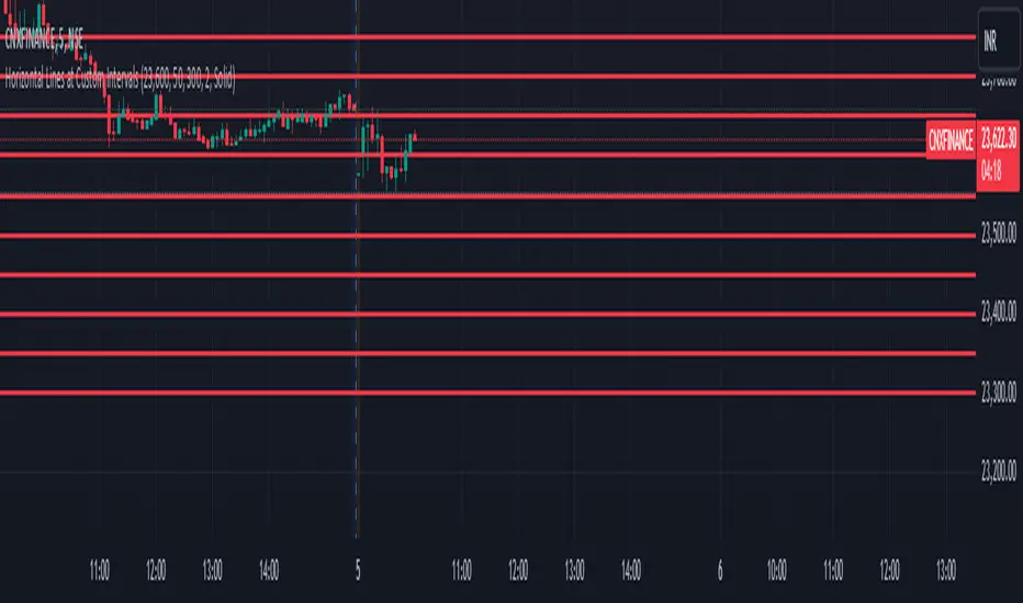 This Pine Script indicator, "Horizontal Lines at Custom Intervals," is a versatile tool designed to help traders visualize key price levels at regular intervals above and below a specified starting price. It is particularly useful for identifying support and resistance zones, psychological price levels, or potential entry and exit points around a central price reference.