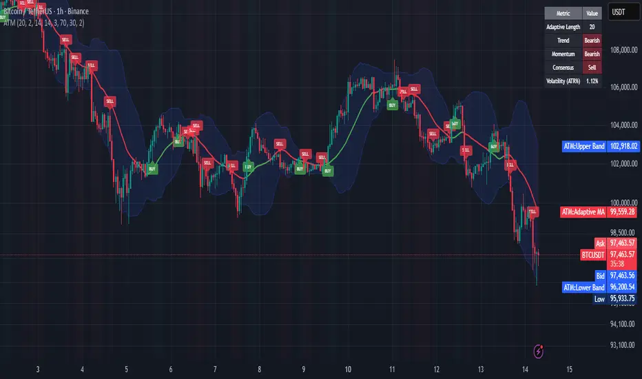 The Adaptive Trend & Momentum (ATM) indicator is a powerful, next-generation trading tool designed to eliminate chart clutter and provide clear, high-conviction signals. Instead of using multiple conflicting indicators, the ATM system combines trend, momentum, and volatility into a single, cohesive, and adaptive framework. It automatically adjusts to changing market conditions, giving you a reliable edge in any environment.