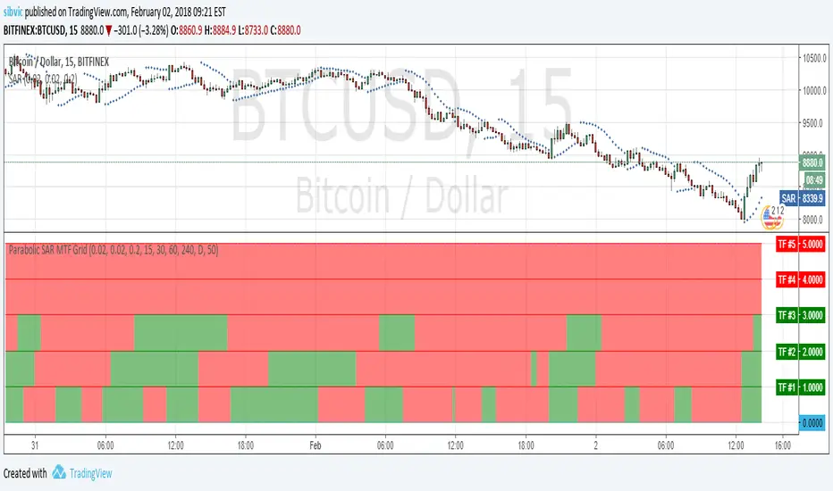 Show a grid with Parabolic SAR in 5 timeframes. Shows an alert when the Parabolic SAR show the same direction for all 5 timeframes.