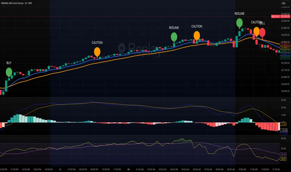 BUY, SELL, RESUME, & CAUTION signal (EMA 9 & 20 + MACD)