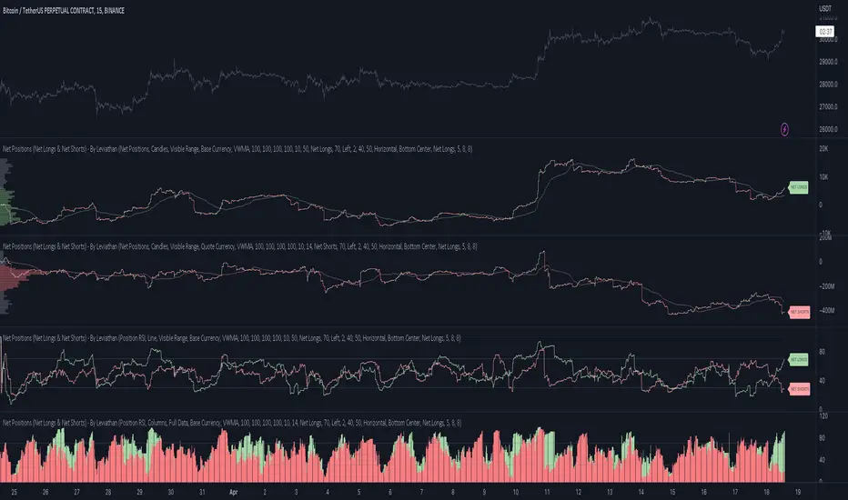 This script is an experimental indicator that visualizes the entering and exiting of long and short positions in the market. It also includes other useful tools, such as NL/NS Profile, NL/NS Delta, NL/NS Ratio, Volume Heatmap, Divergence finder, Relative Strength Index of Net Longs and Net Shorts, EMAs and VWMAs and more.