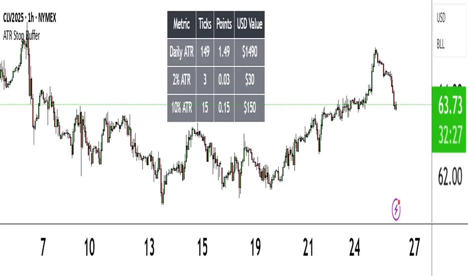ATR Stop Buffer displays the Daily Average True Range (ATR) and customizable percentage values in ticks, points, and USD, shown in a table. Helps traders set volatility-based stop-loss buffers.Features: