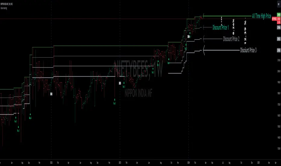Buy signals are generated when the market price(Low of the candle) crosses under any of the defined discount levels. Each level has a corresponding buy label ('Buy 1', 'Buy 2', 'Buy 3'), which is activated upon the price crossing below the specified discount level and is only reset at the beginning of a new year or upon reaching a new reference high, ensuring signals are not repetitive for the same price level.