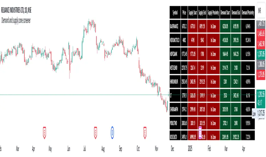 The screener provides traders with real-time, actionable insights across multiple stocks and markets. Whether you're trading stocks, indices, forex, or commodities, this tool delivers reliable demand and supply zone detection backed by price action and volume analysis. Suitable for both intraday and swing traders, it offers a complete solution for identifying potential market turning points across all timeframes.
