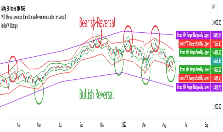 • The indicator is a visualization of maximum price in which the respective index can go up to in comparison with it's Volatility Index or VIX.