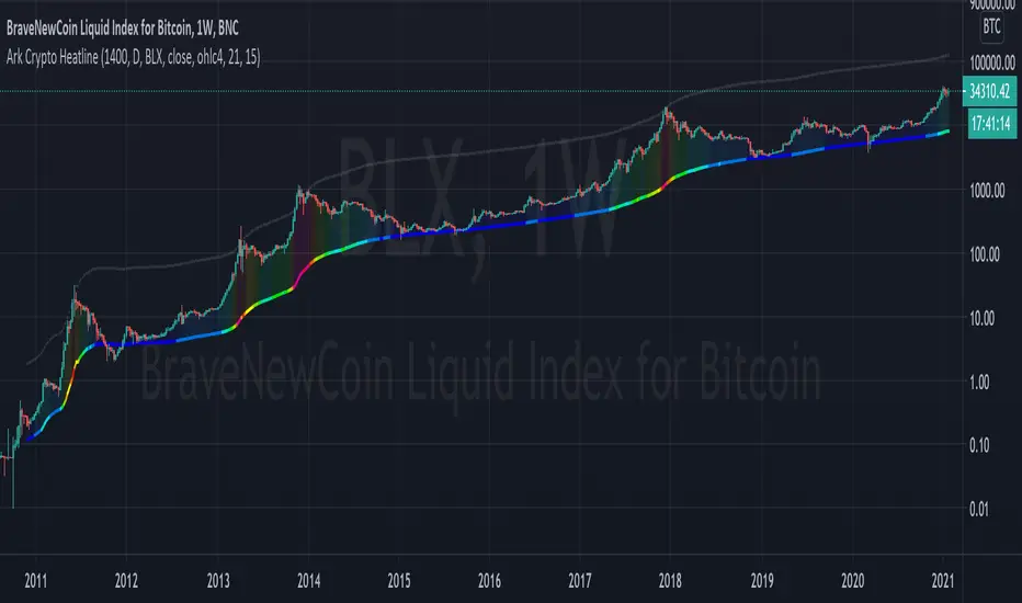 This is the 'on chart' indicator. See also "Ark Crypto Heatband" indicator for a side-by-side BTC view, without a re-scaled line.