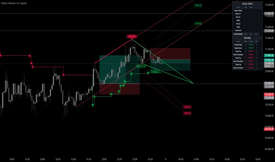 Pattern Detector v3 is an all-in-one chart pattern recognition and signal engine. It automatically detects 16 classic chart patterns, calculates measured-move price projections for each, and generates BUY/SELL signals using a multi-source confluence system that requires multiple independent indicators to agree before firing.