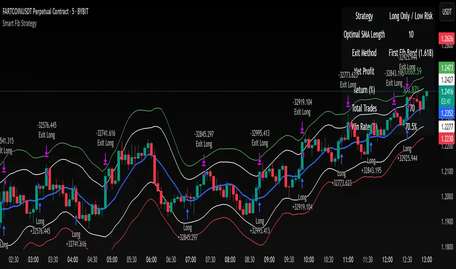 This advanced trading strategy combines the power of adaptive SMA entries with Fibonacci-based exit levels to create a comprehensive trend-following system that self-optimizes based on historical market conditions. Credit goes to Julien_Eche who created the "Best SMA Finder" which received an Editors Pick award.