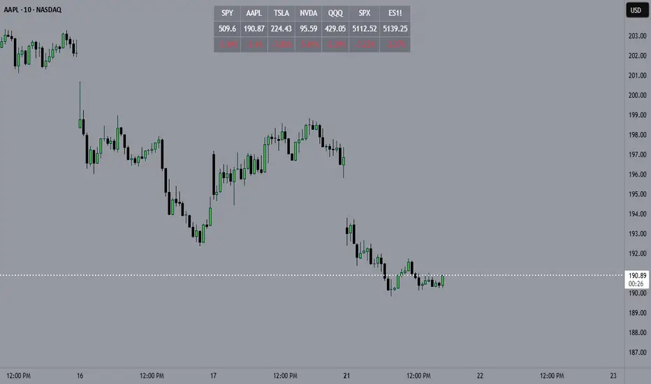 Overview:This script displays a dynamic price table on your chart, showing real-time prices and daily percentage changes for up to 7 user-defined tickers. You can customize both which tickers are shown and how many are visible, all through the settings panel.
