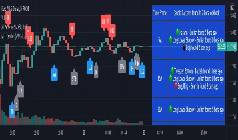This script displays all candle patterns found in multi-time frames for a given lookback period. Candle pattern screening logic is taken from TradingView’s built-in script. The script works with 5m, 15m, 30m, 1HR, 2HR, 4HR, D, W, M timeframe. Works best with 5m chart.