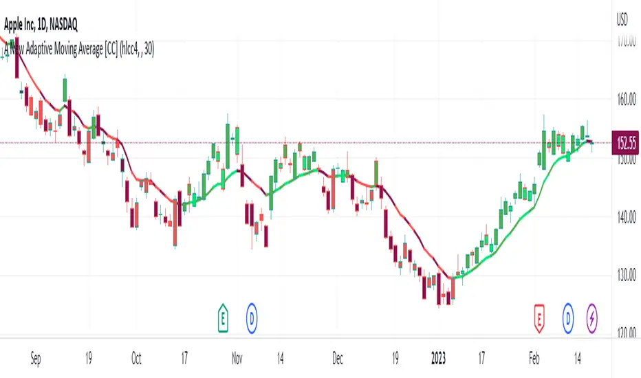 The New Adaptive Moving Average was created by Scott Cong (Stocks and Commodities Mar 2023) and his idea was to focus on the Adaptive Moving Average created by Perry Kaufman and to try to improve it by introducing a concept of effort vs results. In this case the effort would be the total range of the underlying price action since each bar is essentially a war of the bulls vs the bears. The result would be the total range of the close so we are looking for the highest close and lowest close in that same time period. This gives us an alpha that we can use to plug into the Kaufman Adaptive Moving Average algorithm which gives us a brand new indicator that can hug the price just enough to allow us to ride the stock up or down. I have color coded it to be darker colors when it is a strong signal and lighter colors when it is a normal signal. Buy when the line turns green and sell when it turns red.