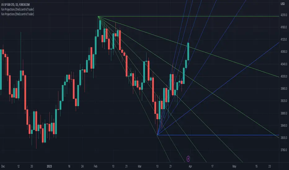 This indicator automatically projects trendlines in the shape of a fan, from a single point of origin. In the example above I have applied the indicator twice to the 1D SPXUSD. The seven upper lines (green) are projected at an angle of -5 from the 1-month swing high anchor point. And the five lower lines (blue) are projected at an angle of 10 from the 1-week swing low anchor point.