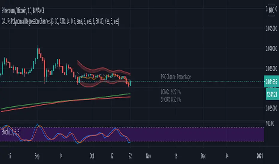 This label is at the lower side a bit ahead of the current candle. Provides you info on what is the channel percentage. This is especially helpful in crypto markets to gauge your possible percentage profit where profits can be much higher than forex or other instruments. It can also helps you select a suitable market/instrument if the channels are based on ATR.
