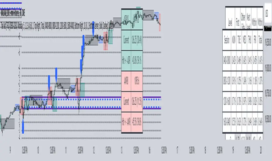 The next section, Distributions, primarily measures and displays the average price movements from specified intraday time windows. The option to Show Distribution Boxes will overlay a box showing each respective session's average range, while adjusting itself to encapsulate the price action of that session until the average range is met/exceeded. Users can choose to display the range average by Day of Week, or the Total average from all days. Values for average ranges can either be shown as point or percent values. We can also show a table to display this information about price's average ranges for each given session, and show labels displaying the current range vs its average.