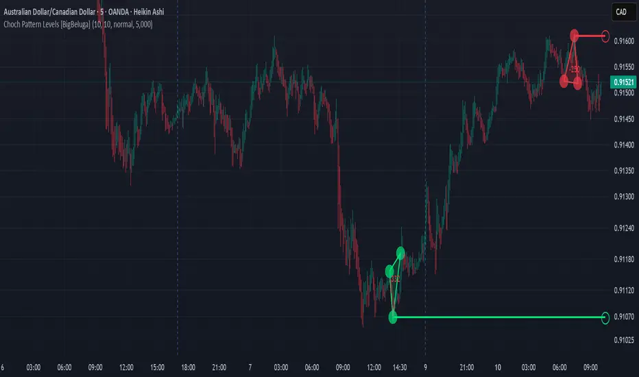 Choch Pattern Levels WITH ALERTS [credit to: BigBeluga] highlights key structural breaks that can mark the start of new trends. By combining precise break detection with volume analytics and automatic cleanup, it provides actionable insights into the true intent behind price moves — giving traders a clean edge in spotting early reversals and key reaction zones with real-time alerts for precision to evaluate and enter markets.