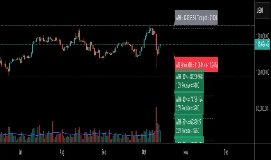 A powerful indicator for tracking All-Time Highs (ATH) and setting customizable price levels based on percentage drops from the ATH. Perfect for cryptocurrency trading, DCA strategies, and risk management.