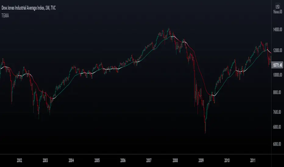This moving average uses a gradient function which calculates the number of advances/declines of the moving average to change the intensity of the colors, meaning a longer trend in either direction will show a stronger color. You can choose 3 colors to build the gradient: a bullish, bearish & neutral/transition color. The number of steps chosen will change the speed of color change, with a lower number of steps meaning a faster transition and viceversa.