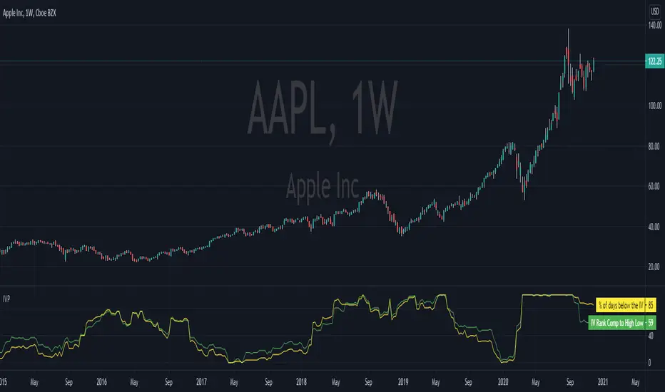 The IV Rank (Green line) is then calculated by looking at the high and low volatility over the number of days back specified in the input parameter, default is 252 (trading days in 1 year) and then calculating the rank of the current IV compared to the High and Low. This is not as reliable as the IV Percentile as the and extreme high or low could have a side effect on the ranking but it is included for those that want to use.