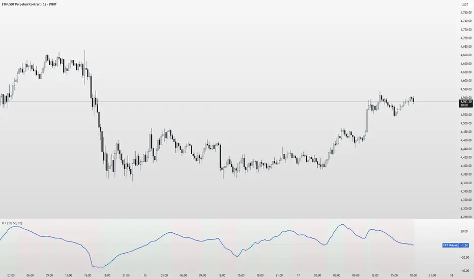 This indicator does not perform actual Fast Fourier Transform calculations. True FFT involves complex mathematical computations for frequency domain analysis that cannot be replicated with simple moving average operations. This indicator provides a detrended, smoothed oscillator based on basic signal processing concepts.