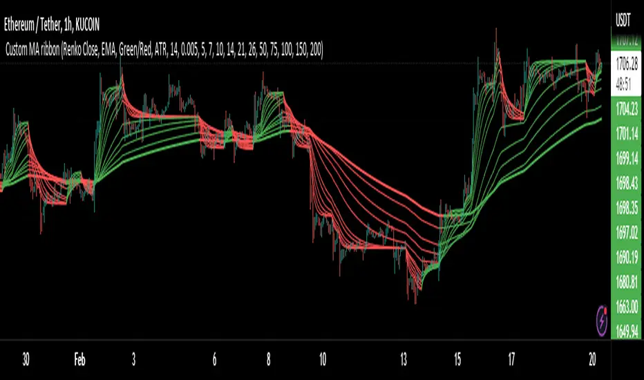 This script can utilize multiple unique sources, including a non-repainting renko closing price. Renko charts focus solely on price movement and minimize the impacts of time and the extra noise time creates. Employing the renko close helps smooth out the MA ribbon. Insignificant price movements will not cause a change in the plotted lines of the indicator unless a new threshold is breached or a "brick" is created. This is highly useful for quickly identifying consolidation areas or overall flat price movement.