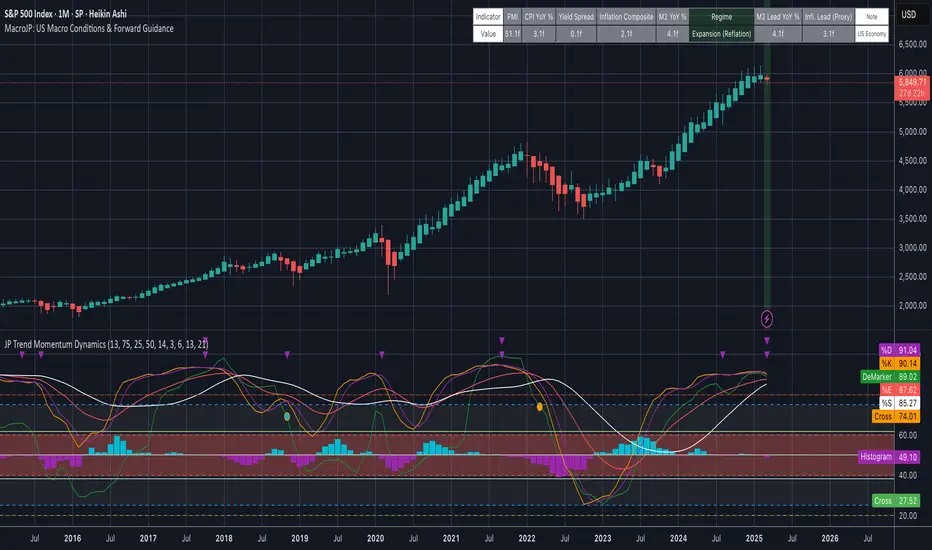 MacroJP is a comprehensive, free-to-use TradingView indicator designed to provide a clear snapshot of the US macroeconomic environment. It consolidates key economic metrics into a single, interactive dashboard, allowing traders and investors to quickly assess current conditions and adjust their portfolio biases accordingly.