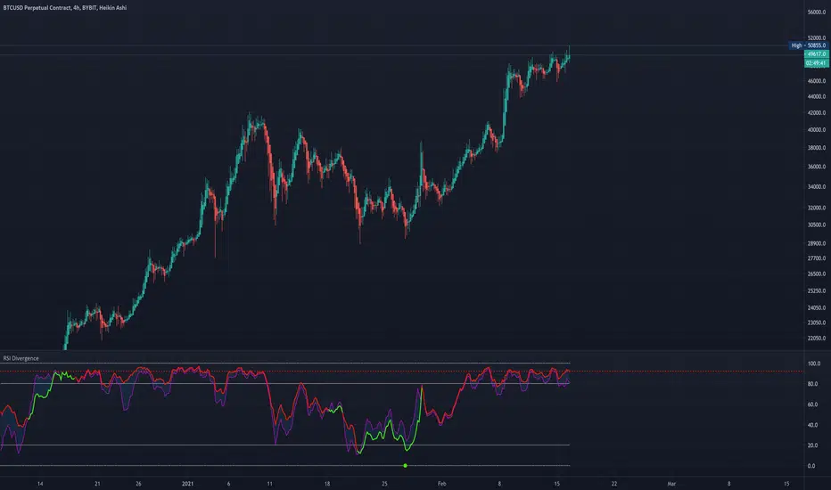 When RSI turns green it signals a bullish divergence and considers the asset as overbought.
