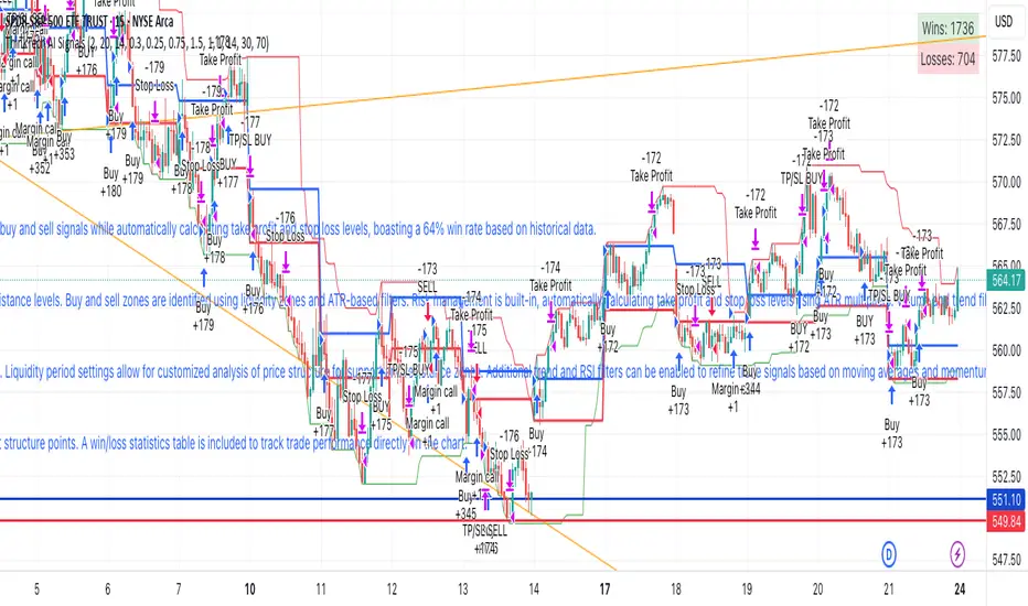 The risk/reward ratio can be adjusted to define the desired stop loss and take profit calculations. The ATR length and threshold determine ATR-based breakout conditions for dynamic entries. Liquidity period settings allow for customized analysis of price structure for support and resistance zones. Additional trend and RSI filters can be enabled to refine trade signals based on moving averages and momentum conditions. A session filter is included to restrict trade signals to specific market hours.