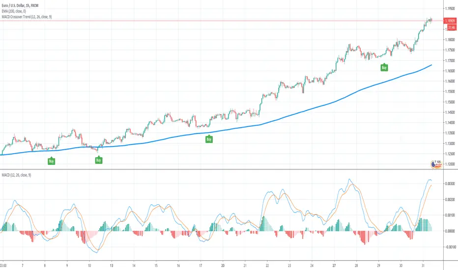 This indicator detects MACD Crossovers based on the current trend. It checks wether the current close price is above or below the 200 EMA and therefore decides whether we are in an up- or down trend.