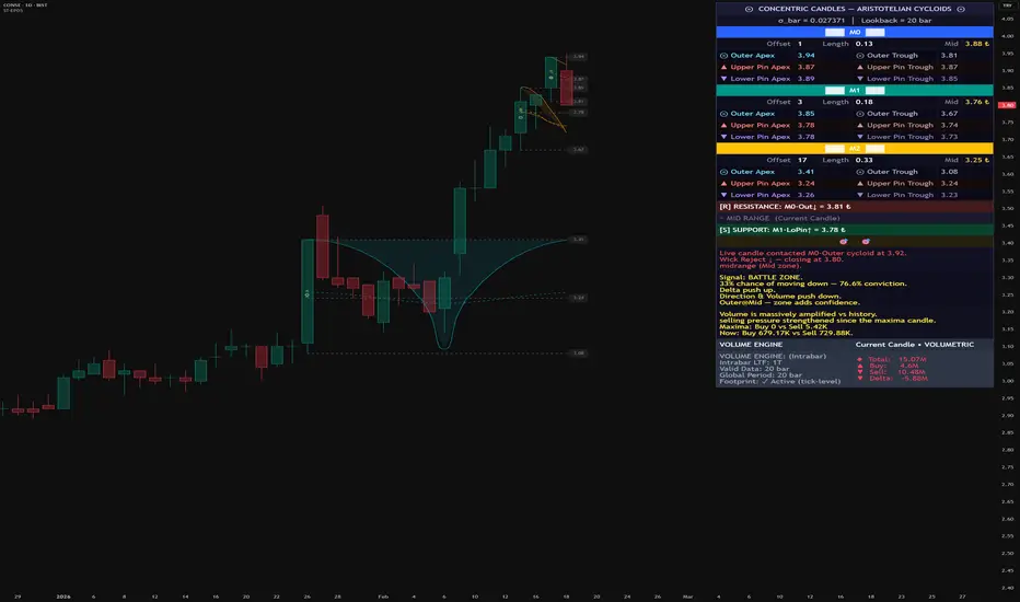 All core features — Concentric Candles, Cycloid Curves, S/R Detection, Volume Engine, and Dashboard — work on all TradingView plans without any restrictions. The CVCA engine is an advanced opt-in feature that requires Premium or Ultimate plan access for full functionality.