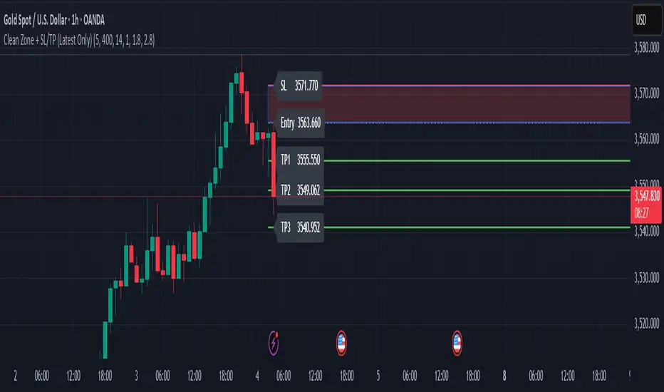 Clean Zone + SL/TP (Latest Only) is an indicator designed to highlight the most recent supply or demand zone based on pivot highs/lows, and automatically plot entry, stop loss, and multiple take profit levels.