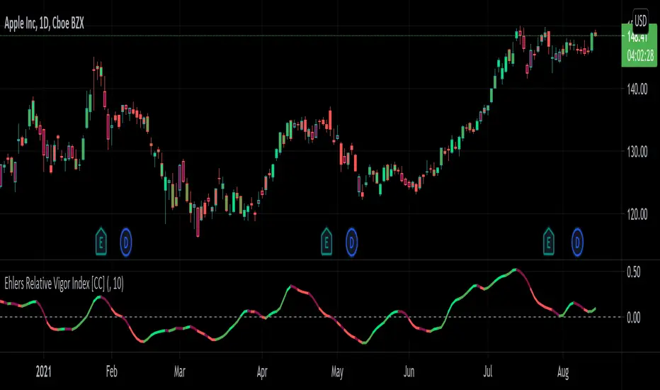 The Relative Vigor Index was created by John Ehlers (Cybernetic Analysis For Stocks And Futures pg 58) and this is a momentum indicator that is similar to the Accumulation Distribution Oscillator created by Jim Waters and Larry Williams. He uses digital signal processing to smooth the indicator to provide clear buy and sell signals. The idea behind this indicator is that during uptrends, prices tend to close near the high and during downtrends, prices tend to close near the low. I have included strong buy and sell signals in addition to normal ones so strong signals are darker in color and normal ones are lighter in color. Buy when the line turns green and sell when it turns red. Usually the best signals I have found for this indicator is when the indicator is below the 0 line and turns green then it is usually a sign of a strong uptrend.