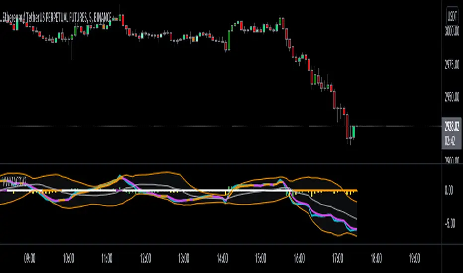 Volume Weighted Macd V2, "Here in this version; Exponential Moving Averages used and Weighted by Volume instead of using only vwma (Volume Weighted Moving Averages)." Says, Kıvanç Özbilgiç.