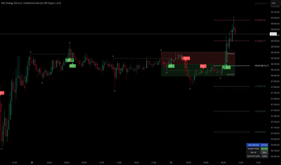 Description: The SMC Strategy Tool v1.0 is a comprehensive technical analysis suite designed for traders following the Smart Money Concepts (SMC) methodology. It combines market structure, institutional liquidity zones, and mathematical pivots to provide a high-probability trading environment.