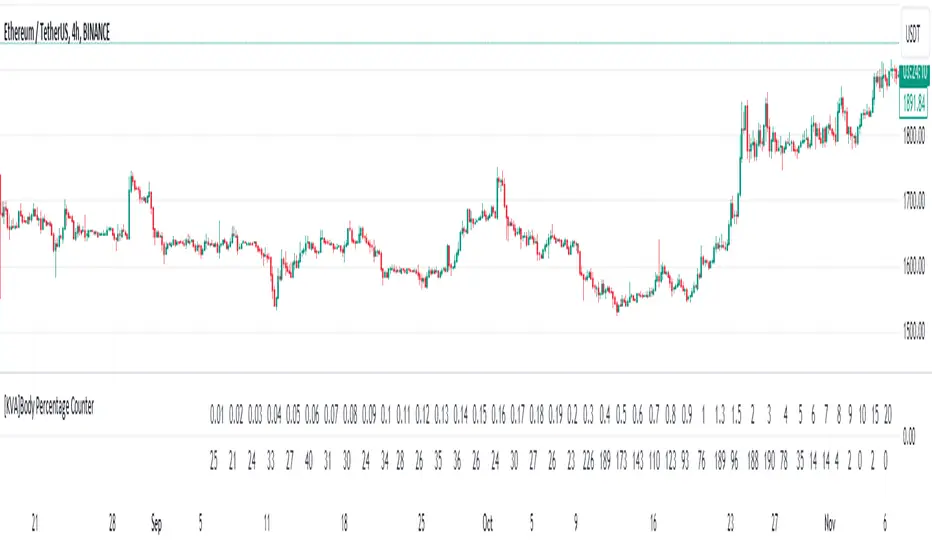 This indicator presents a comprehensive view of the historical candle data within user-defined body percentage ranges. Each column represents a specific body size percentage threshold, starting from as low as 0.01% and extending up to 20%.