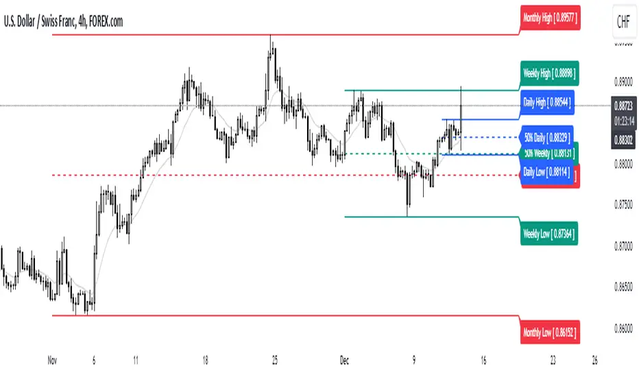 - Monthly, Weekly, and Daily Levels: Displays the High, Midpoint, and Low of the previous month, week, and day.