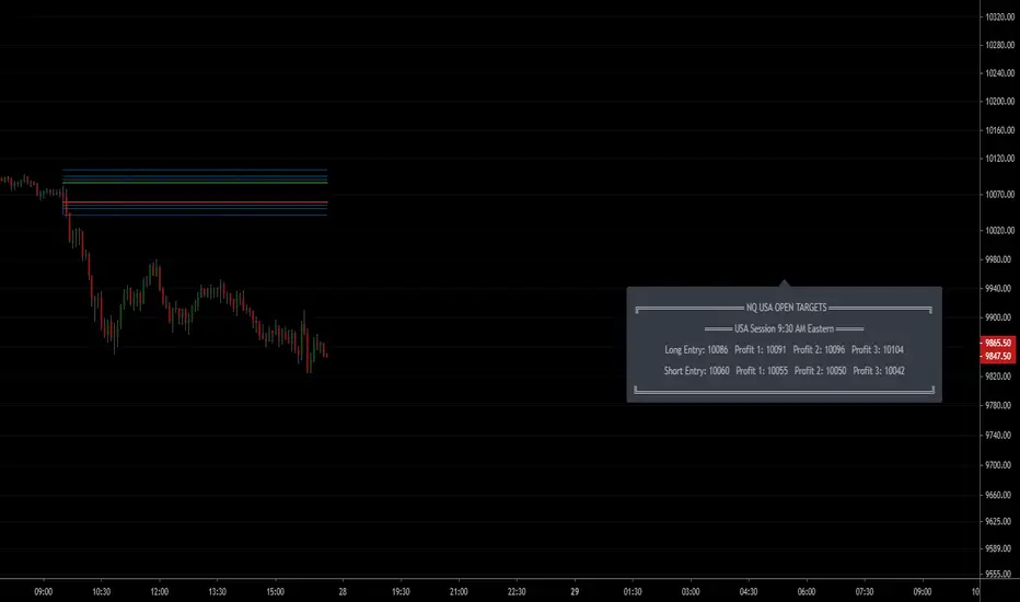 The lines and the text box are updated after the first 1 MINUTE bar closes for USA session. The USA session open is defined as 9:30AM - 9:31AM, Eastern time.