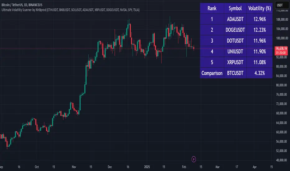 This script gets and compares the 14-day volatility using the ATR percentage for a list of cryptocurrencies and stocks. Cryptocurrencies are preloaded into the script, and the script will show you the TOP 5 coins in terms of volatility, and then compares it to the Bitcoin volatility as a reference. It updates these values once per day using daily timeframe data from TradingView. The coins are then sorted in descending order by their volatility.