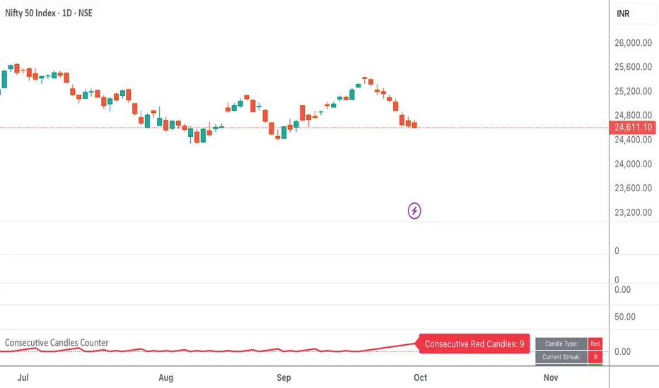 The Consecutive Candles Counter is a simple yet powerful indicator designed to help traders identify and analyze consecutive red or green candle patterns on any timeframe. This tool automatically counts unbroken streaks of bullish or bearish candles within your specified date range, making it easier to spot momentum trends and potential reversal points.